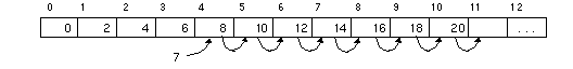 The solution is to move all the numbers in position 4 and after, one position higher in the array. Thus, the number 20 is moved from position 10 to position 11, the number 18 is moved from position 9 to postion 10, the number 16 is moved from position 8 to position 9,..., and the number 8 is moved from position 4 to position 5. Now position 4 is vacant and can be used to insert the number 7, keeping the array in sorted order.